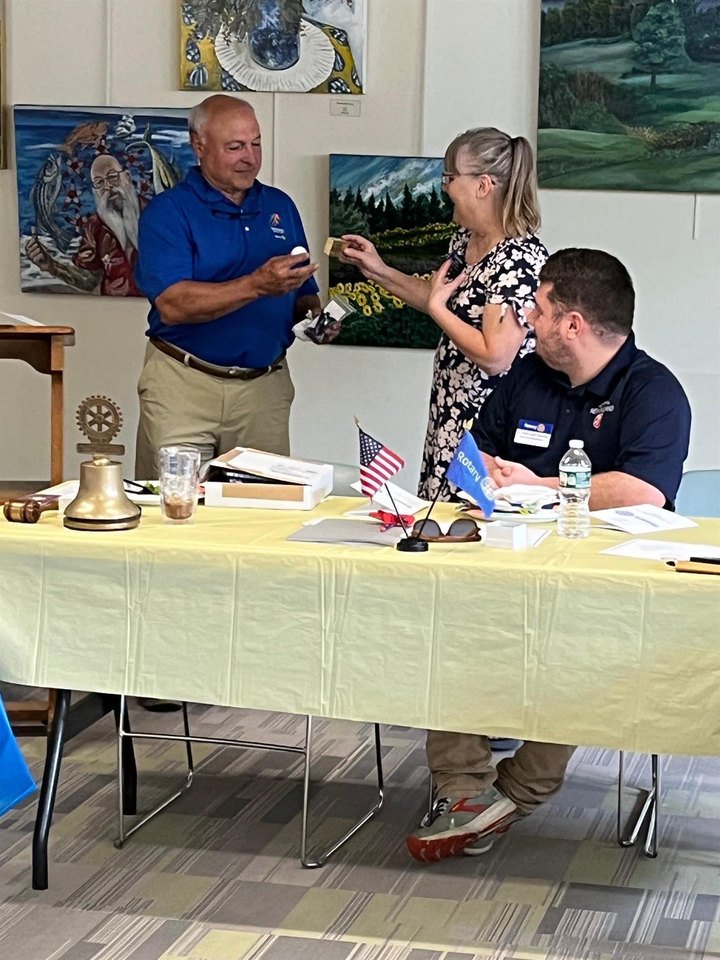 She then presented the Rotarian of the Year to Eddie Rousse along with a special golf ball because he likes golf so much.