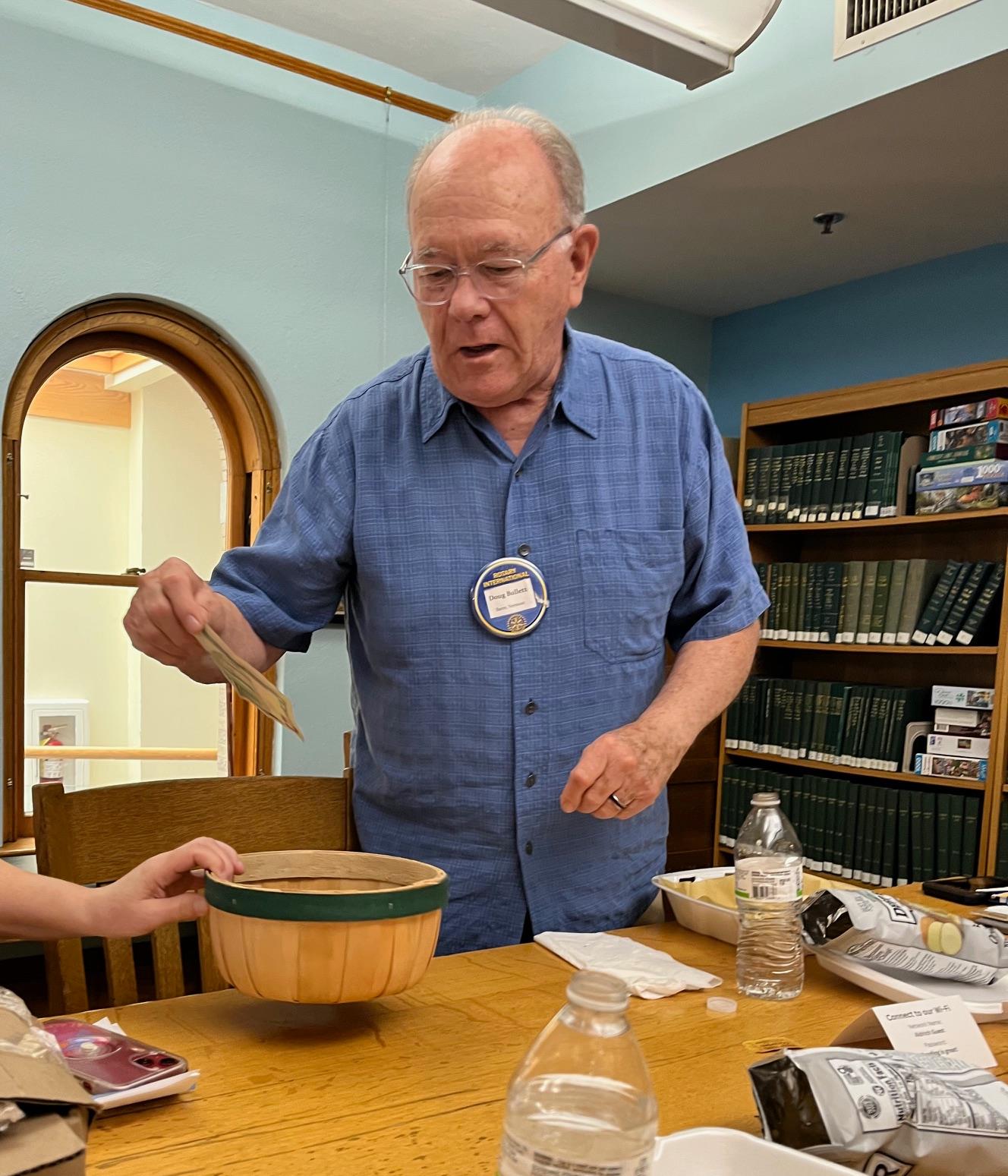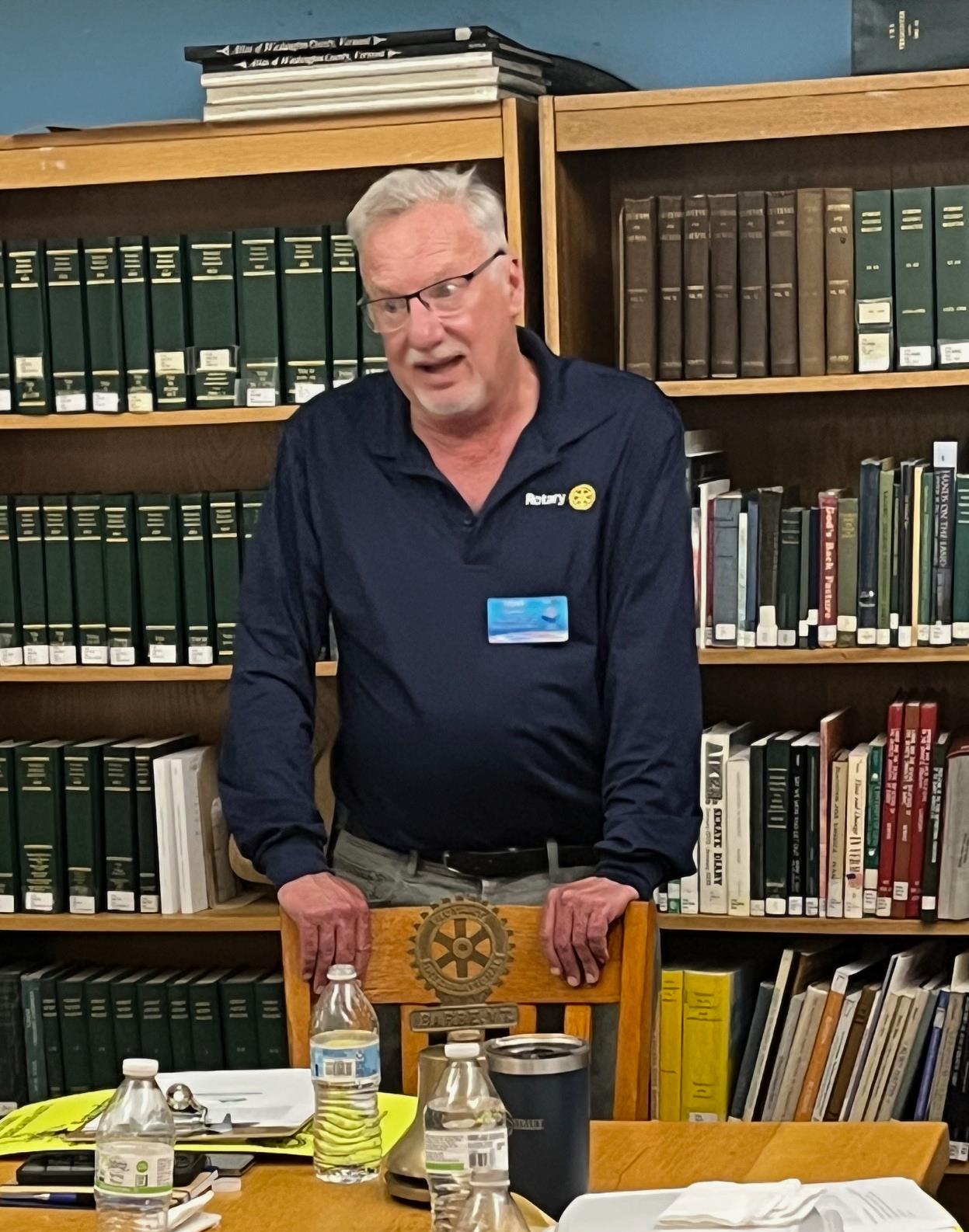 With rituals complete, President Tony recognized Caroline who had a Sad Dollar because she noticed that our Rotarian of the Year, Eddie Rousse, was in the hinterland collecting money. He assured her that he was perfectly happy performing his duties as treasurer.