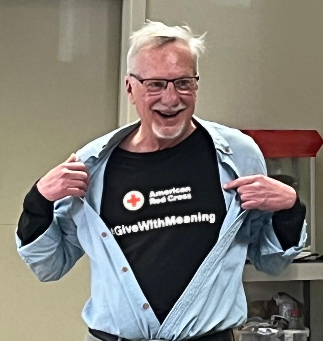 Tony rose and unbuttoned his shirt to reveal his secret identity--Superman. The super giver of a 1000 pints of blood encouraged us to join him in giving blood through the Red Cross blood drives, declaring that it was “fun.”
